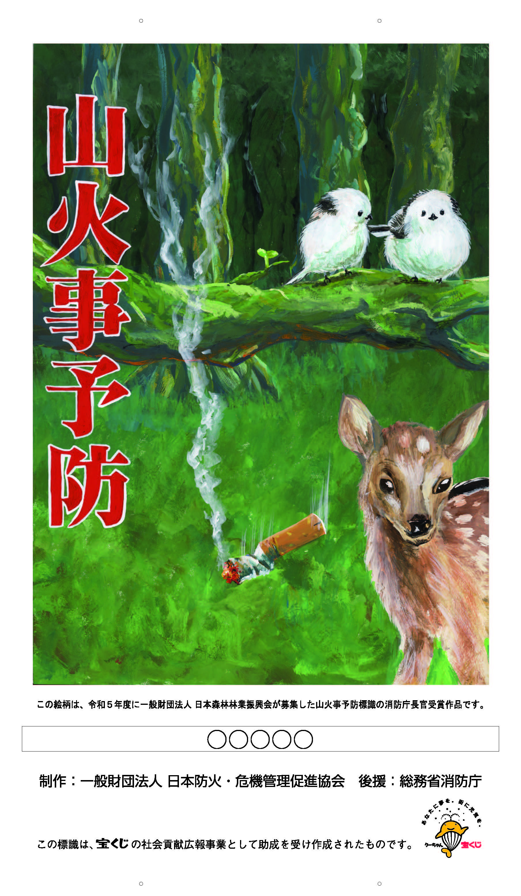歴代林野火災防止用標識を見る毎年、秋から春にかけ林野火災が多発する時期に合わせ、登山道やハイキング コースなど入山者の多い場所に掲示し入山者に火災予防を呼び掛けるための「林野火災防止用標識」を、(一財)日本宝くじ協会の助成を受けて作成しています。 標識の図柄は、(一財)日本森林林業振興会が全国から募集する「山火事予防ポスター」のうち、消防庁長官賞を受賞した作品を使用しています。